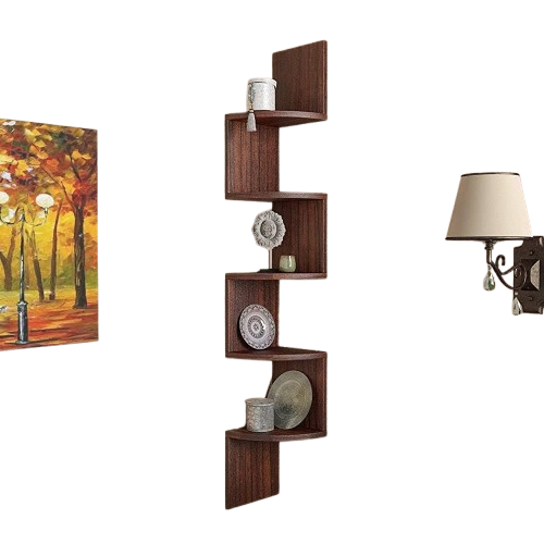 This is a space-saving and modern floating corner shelf unit. It features a unique zig-zag or S-shape design with five individual shelf sections, transforming an unused corner into a decorative display area. Crafted from dark brown wood with a visible grain texture, the unit mounts directly to the wall without visible supports, giving it a sleek, floating appearance. It is ideal for showcasing small decorative items, photo frames, candles, or small indoor plants in a living room, bedroom, or entryway.